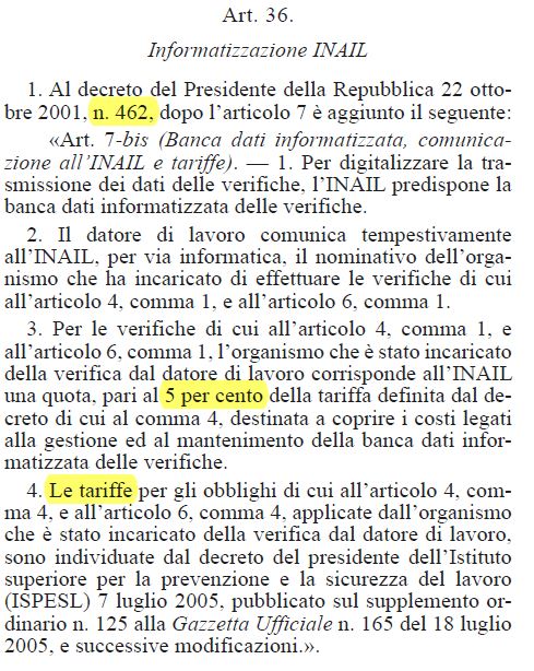 - L’organismo abilitato dovrà versare ad INAIL il 5% della tariffa della verifica periodica, quale contributo coprire i costi legati alla gestione ed al mantenimento della banca dati informatizzata